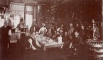 Employees of Basche Sage in workroom, with pot bellied stove. Fourteen men and one woman in picture. Dinner being served.