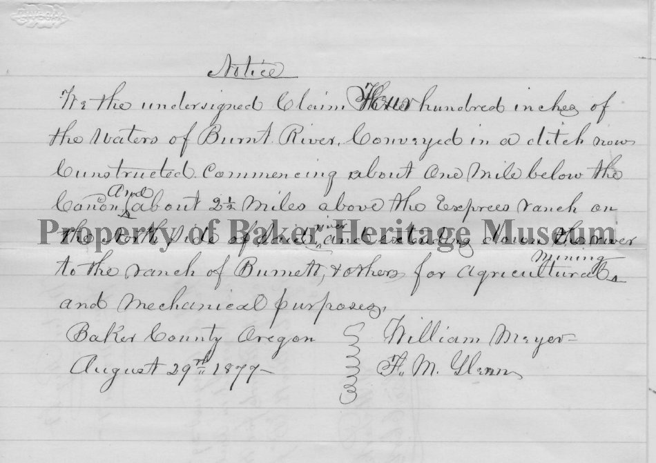 William Meyer and FM Glenn claim 400" of water of Burnt Riverat a location 21/2 miles above Express Ranch for agricultural,mining and mechanical purposes. Dated and filed August 29th, 1877 by GW Parker, Clerk