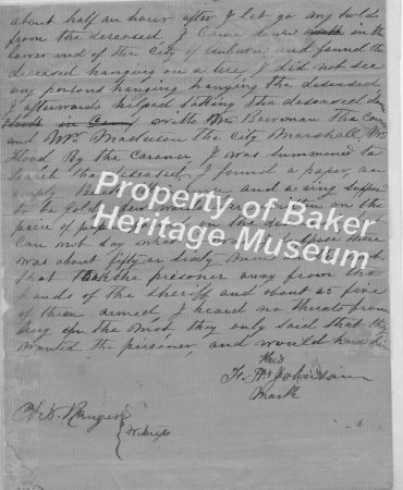 Deposition by FA Johnson, jailer, re: Spanish Tom's lynching, November 21st, 1862 by mob of 50—60 men. Witnessed by HS Ranger.