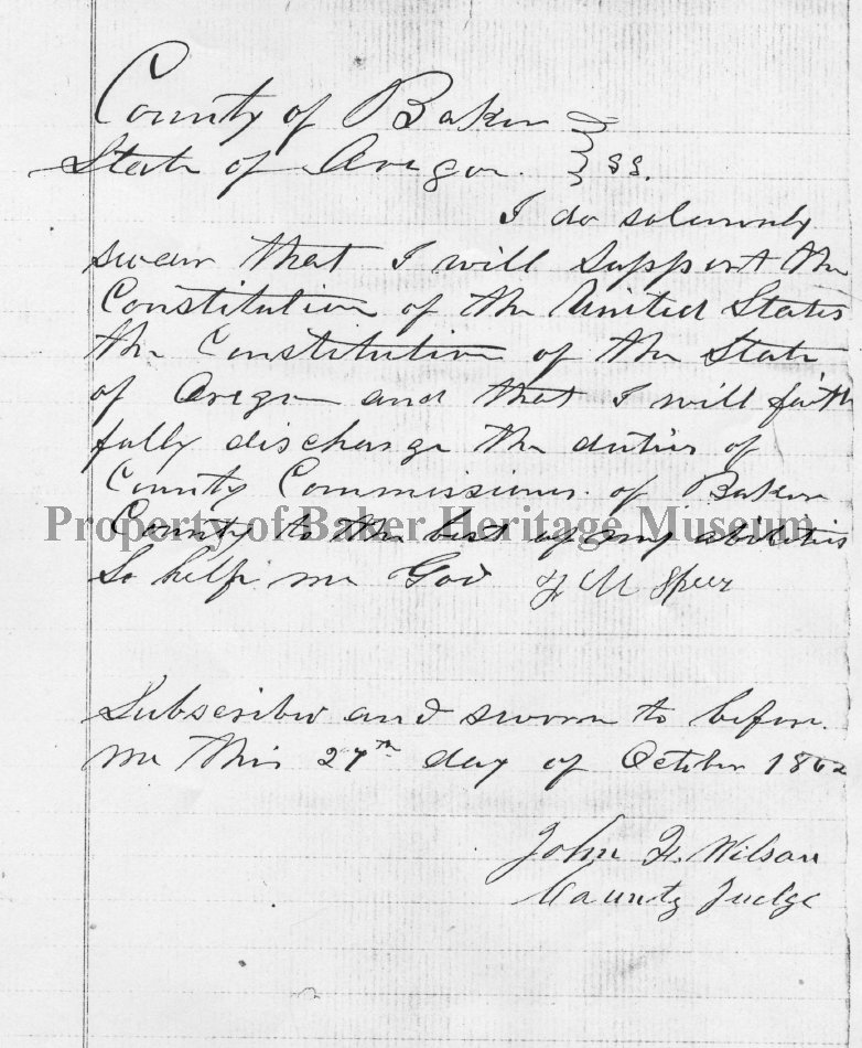 FM Speer oath of office as County Commissioner for Baker County. October 27th, 1862 by John Q Wilson, County Judge