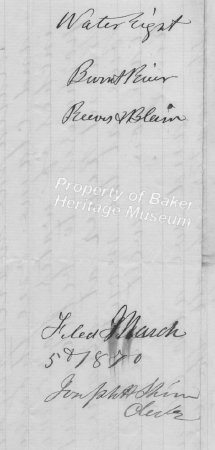 SB Greeves, A Moore and Wm Blain apply for water rights on West side of Burnt River and all the gulches down to Gillezes toll gate. March 5th, 1870. Filed same date by Joseph Shinn, Clerk.