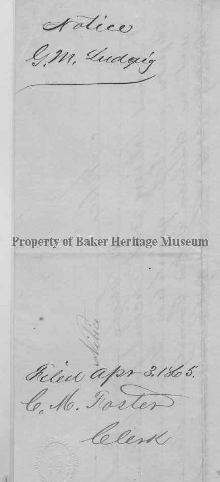 Ludwig, GM Liquor License, Auburn, dated March 22nd,1865. Filed by CM Foster, Clerk , April 3rd, 1865.