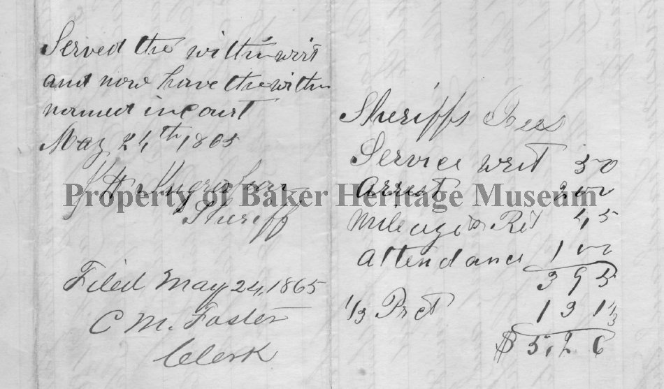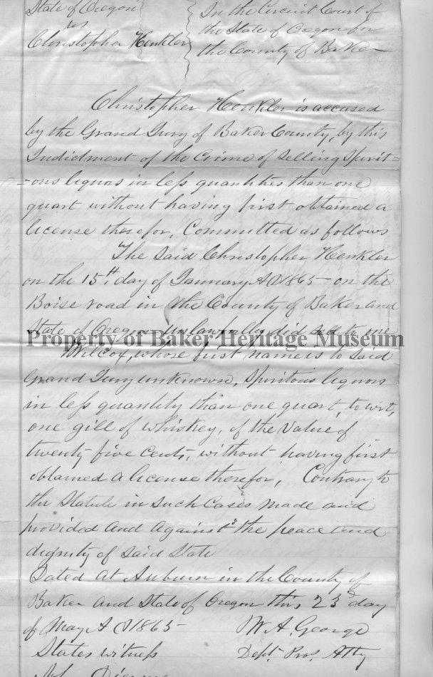 Christopher Henekler being tried for selling 1 gill of whiskey without a license at an establishment on Boise Road. Indicted by Grand Jury on January 25th, 1865. Trial was on May 24 and 25, 1865. Fined $50 and kept in jail until fine was paid. States witness was John Diermer, Prosecuting Attorney was WA George, Defense Attorney was RA Pierce, Jury members were: RA Steel, John Burgess, F Wilson, W Ellis, James McCrary, Sam G Ward, William Corcoran, DS Littlefield, A Agustus, PF Flynn, George Russell, SA Caldwell(foreman). JG Wilson was Circuit Court Judge. Filed July 12th, 1865, by CM Foster, Clerk.