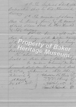 Powder River Road Co Articles of Incorporation with partners AB Roberts, DH Belknap, IG Baskett. Purpose to build a road from Immigrant Road to intersect the Powder River, Grande Ronde and Walla Walla Road. November 29th, 1862. Signed by all partners and Samuel A Clarke, Clerk.(Duplicates 298)
