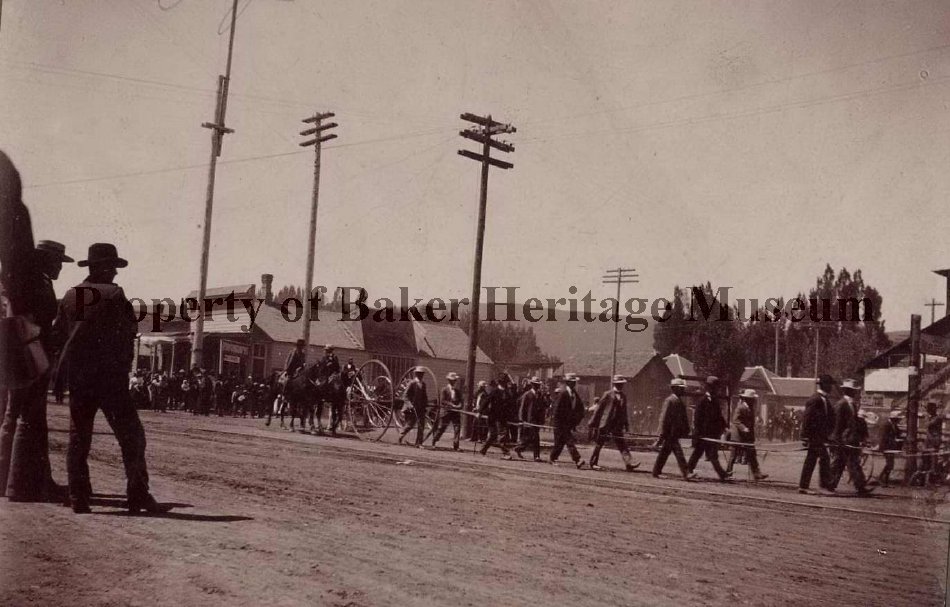 Hose companies of fire fighters. Black and white picture of men attached to straps pulling a wagon. Looks like a parade in "Baker, Oregon ,on Main and Auburn Hose Company 4th of July 1899"
