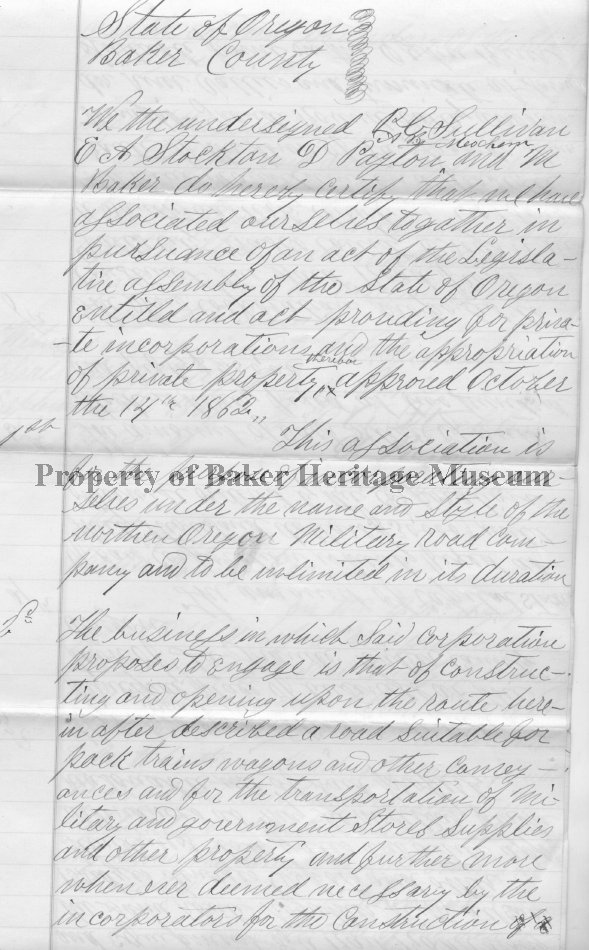 Northern Oregon Military Road Company Articles of Incorporation, October 14, 1862, Filed September 23rd, 1864 by CM Foster, Clerk and WL Chittendon, Deputy. Second filing in Clerks Office, Baker County September 26th. 1864. Company Officers: RB Sullivan, BA Stockton, D Payton, AB Meachum, M Baker. Business located in LaGrande. Capital stock $30,000. Shares fixed at $250. Route for the road is from The Dalls City, Wasco County, crossing the Blue Mts thru LaGrande to terminate on the Oyhee River. Also included a railroad along the same route. Vouched for by SD Reinhart, Justice of the Peace, Baker County on September 22nd, 1864.