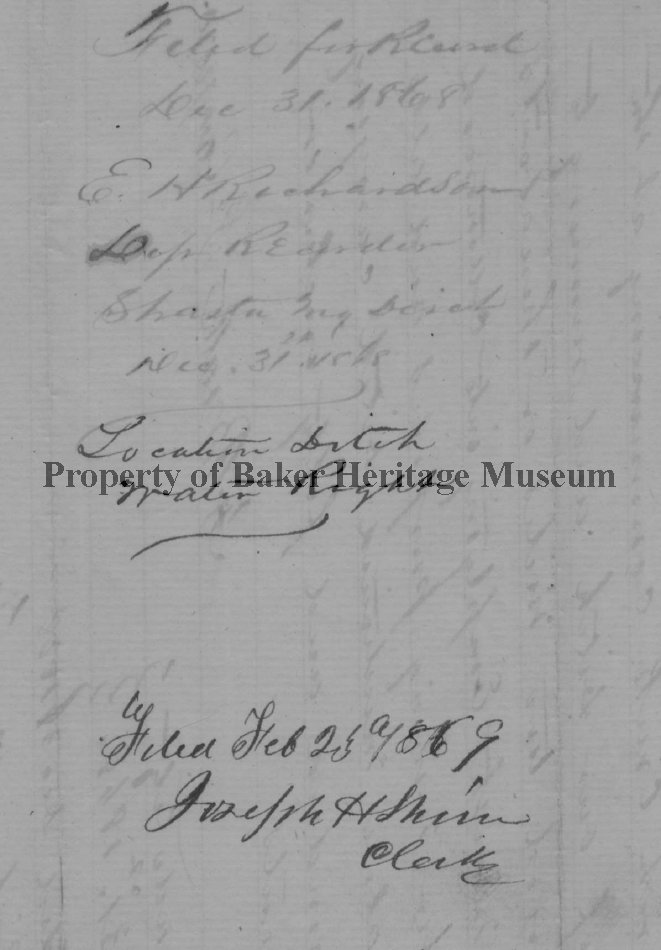 Eldorado City water rights to Birch Creek, Dec. 31, 1868. Recorded Dec 3 1,1868., E. H. Richardson, deputy recorder. Filed Feb 25, 1869, Joseph H. Shinn, clerk.