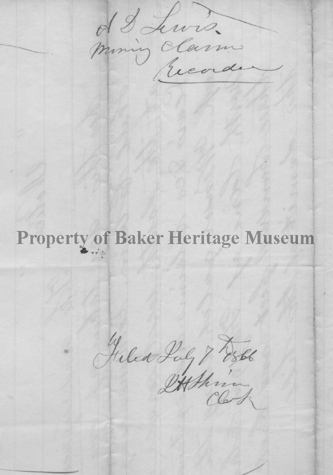D. Lewis claims 1 hill commencing at the SW corner of Lewis and Company claims and extending 300 feet up Winsor Gulch along the north line of Fray claim. Dated July 5th, 1866. Filed July 7th, 1866, by Joseph H Shinn,mClerk.