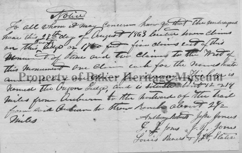 Mining claim, Anthony Roberts, G. L. Jones, Louis Reners, Jepe Jones, J. J. Jones, and J. H. Slater. 1750 feet, five claims east of this monument of stone and two claims to the west of this monument, one claim each for the names hereto annexed, and one claim for discovery. Oregon Ledge, 12 or 14 miles from Auburn to the northward of the trail from Auburn to Straw Ranch, about 2 1/2 miles. Sept 26, 1863, S. A. Clarke, clerk.