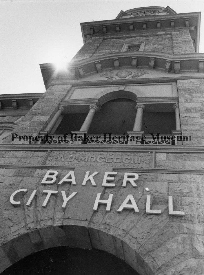 Doorway and tower of Baker City Hall. " AD MDCCCCIII Baker City Hall."