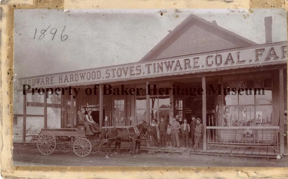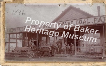 Team and wagon in front of S. B. McCord Hardware. Six men and a boy in picture. Farm tools (hoes, pictures, etc.) in porch rail.