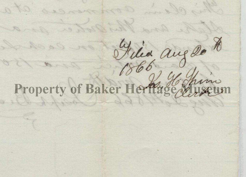 Joseph Beck mining claim on the Summit Ledge, said ledge crosses the same divide as the Oregon Mammoth it is the first ledge south of the Mammoth crossing the Summit 150 feet on each side of stake and notice and 150 feet in width. August 20th, 1866. Filed same date by Joseph H Shimm, Clerk.