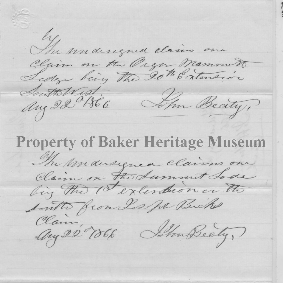 John Beaty mining claims. First claim is on the Oregon Mamouth ledge, 20th extension SW; second claim is on the Summit Load, 1st extension S from Joseph Bickes claim. Signed August 22nd, 1866. Filed by JH Shinn, February 22nd, 1866.