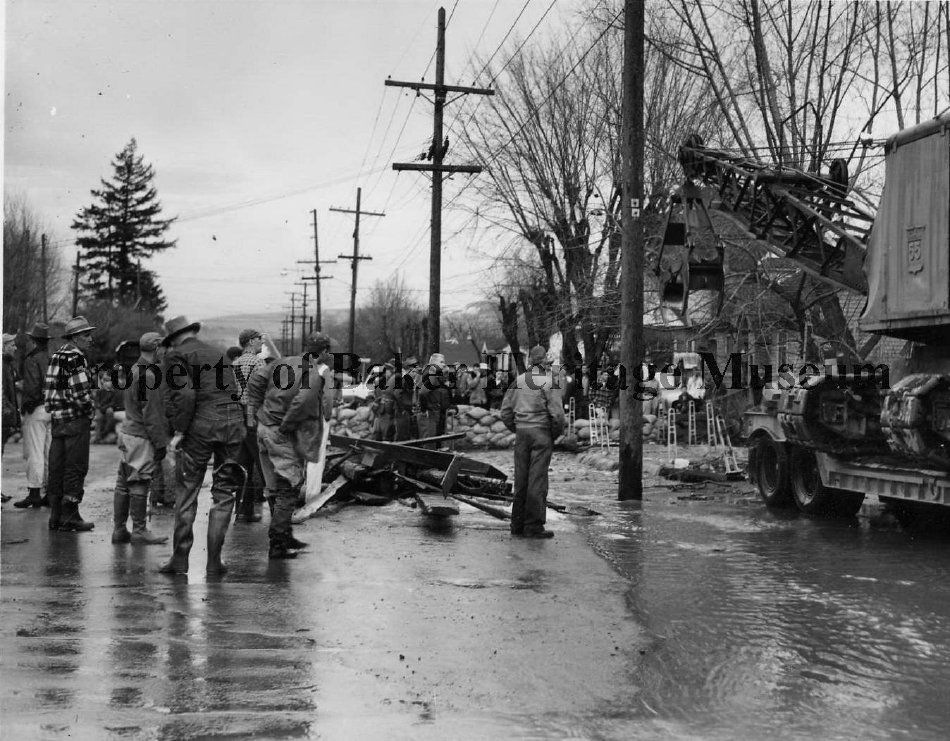 Powder River flood 1957, Washington Street at Baker Garage, east side of river. Photo by Jack Eng. Other photos show west side of river.