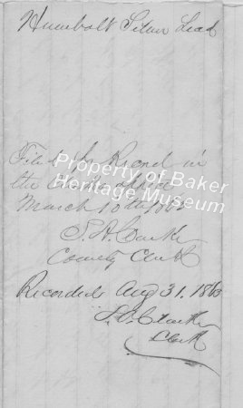 Lewes, EL; Henry, Geo M; Gabriel, Wm; Young, Peter; Ingraham, JH; Miller, Charles; Arnold, Geo; Lowe, Thomas; Glover, Sam; Copp, John claim 5 miles SW of Humbolt Basin on ridge dividing Willow Creek from Clarkes Creek and 300 yards N of Black Hawke Silver lead. Called the Humbolt Quartz lead. Filed March 10th, 1863. Recorded August 31st, 1863 by SA Clarke, Clerk.