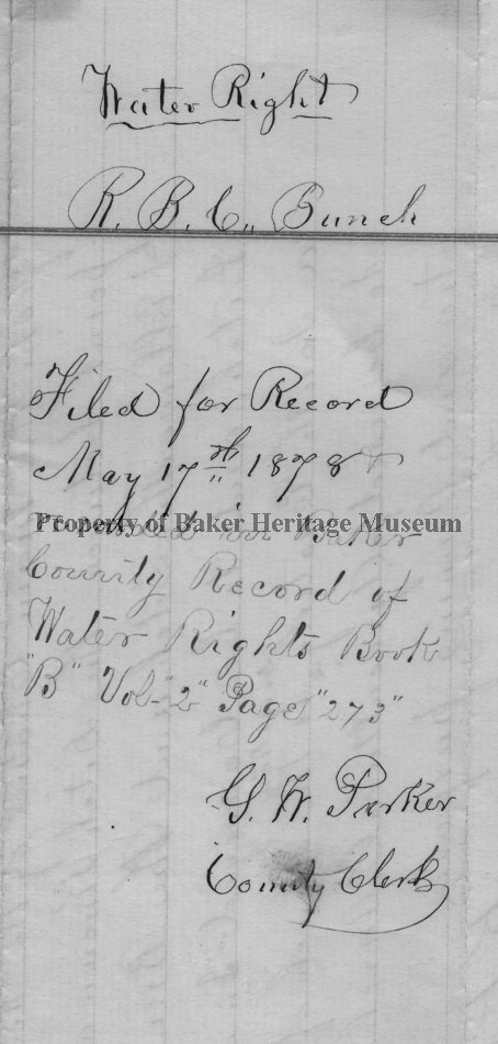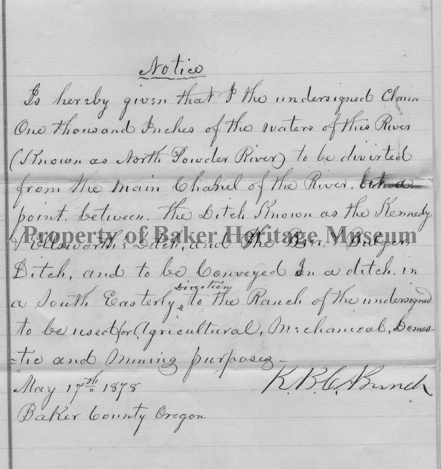 KBC Bunch claims 1000" of North Powder River for agricultural, mechanical, domestic and mining purposes. May 17th, 1878. Filed same date by GW Parker, Clerk