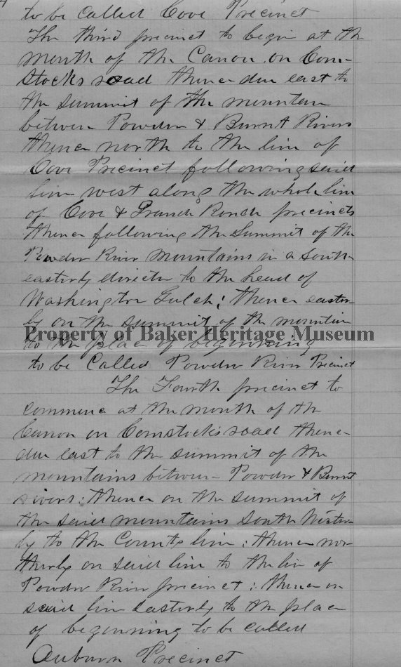 Minutes of the Baker County Commission meeting October 29, 1862. Division of Baker County into precincts: Grande Ronde Precinct (presently Union County), Cove Precinct, Powder River Precinct (Baker Valley up to the mountain crests over to Washington Gulch), Auburn Precinct (everything else)