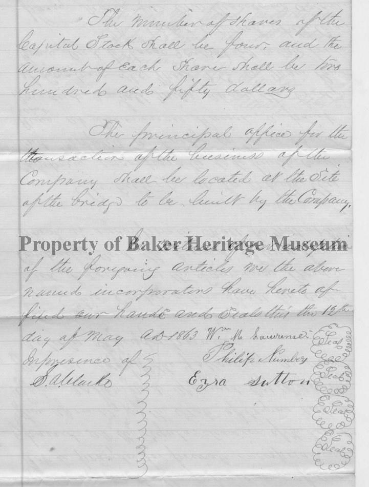 Articles of incorporation for W. M. Lawrence, Philip Numberg, Ezra Sutton and Lutton Hinley, Lawrence Bridge Company, to build a bridge on Main Powder River at Lawrences's Ranch, a point about one and a half miles above the bridge at Copers & Mass & Co. on Main Powder River. Signed by Wm. M. LawrenceEzra Sutton, PHilip Numberg, S. A. Clarke, clerk. June 12, 1863.