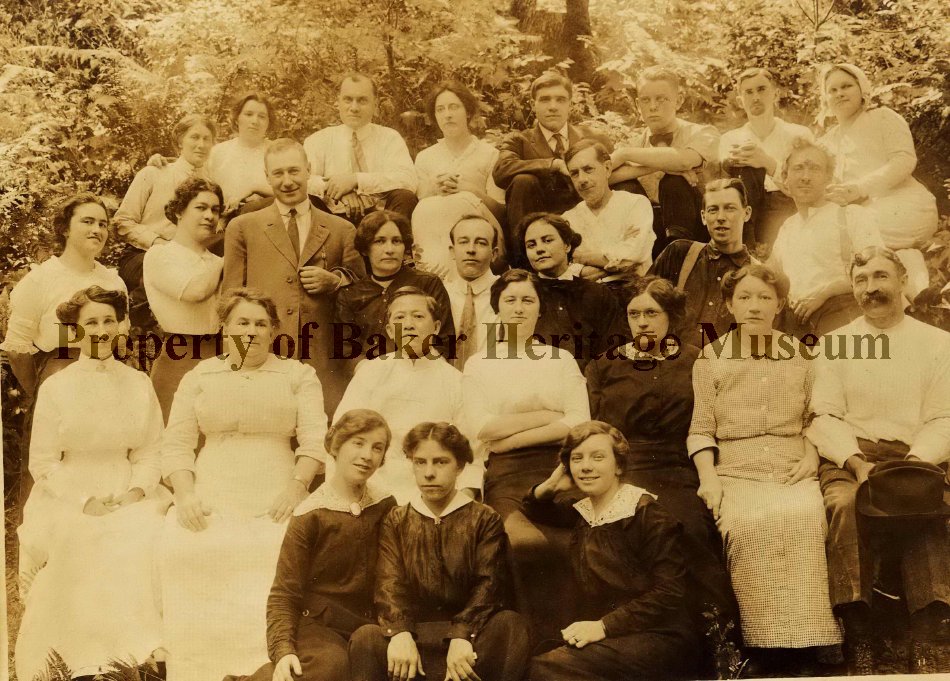 Group gathering, probably a church group, with 17 women and 10 men mostly dressed in light colors.