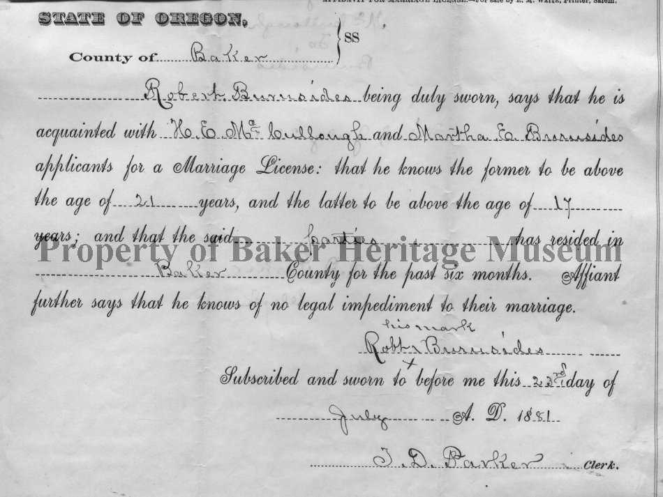 Affidavit from Robert Burnside that he knows HE McCullough and Martha E Burnside as applicants for a marriage license. July 23rd, 1881by JD Parker, Clerk. AE Burnside and DR John Burnside also wrote affidavit of knowledge .