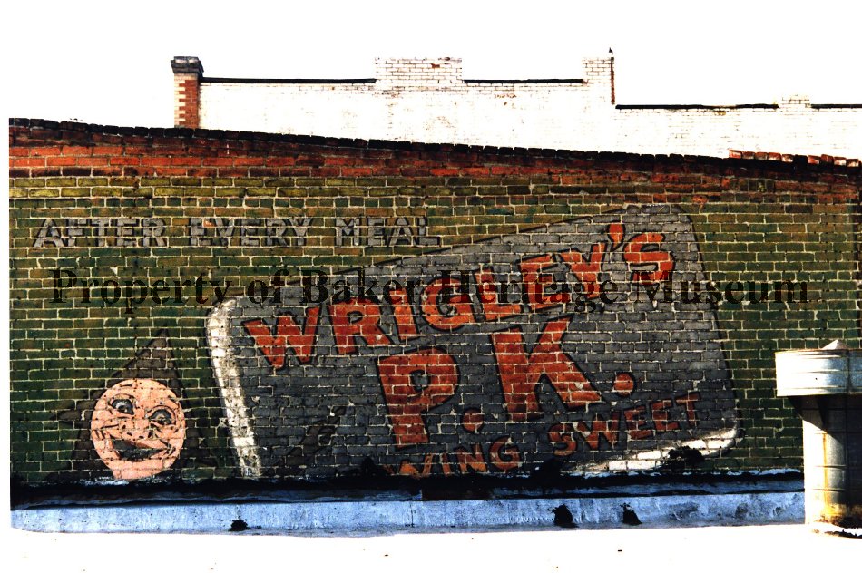 Exterior painted advertising photos donated by Elizabeth "Wibby" Patterson "Mrs. William". 82.30.10.1, 2,3,4. 2 Wrigley's ads on 1921 Main and 1925—29 Main.