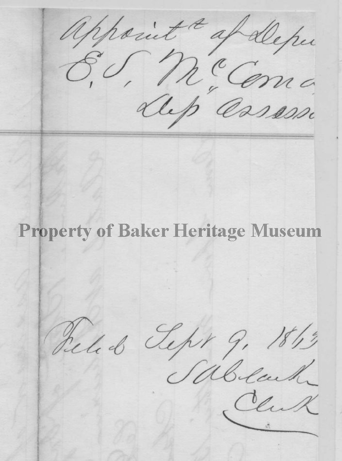 Appointment as Deputy Assessor of Baker County for E. V. McConely, July 13, 1863. by C. Dana Leys, Assessor of Baker County. July 13, 1863, S. A. Clarke, Clerk. Filed Sept. 9, 1863.