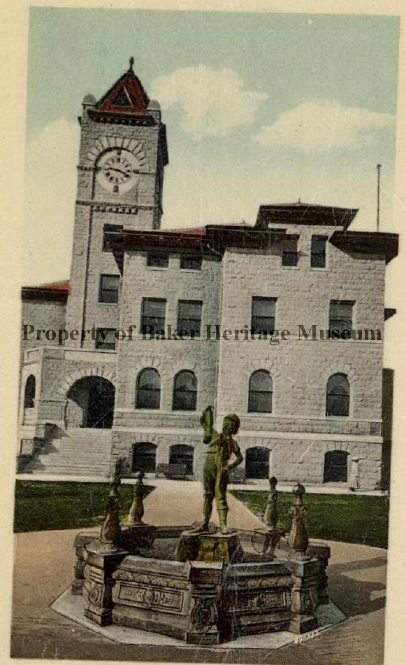 Color painting/postcard of the Court House and Fountain in Baker City, Ore.