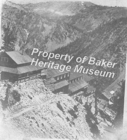 Cornucopia Mines, photos donated by Dorothy J. Rager. #1Johnny Zimmerman photo of Last Chance buildings. #2 Last Chance Mine. #3 Baker Mill taken up toward Last Chance Mill is above Copia town on right side of road. Doris Digetz photo. #4 South side of Baker Mill at end of tramline from Last Chance Mine, 1b975 1917. Harry Thompson photo. #5 On the Last Chance Tramway, Louise Ley picture, Panter photo. #6 Last Chance buildings about 1917. Harry Thompson photo. #7 Last Chance Mine, Denis Digitz photo. #8 Baker Mill terminal from Last Chance Tramway approx. 1917. Harry Thompson helped built Head House. #9 Last Chance head house about 1917. About 60 feet high. Harry Thompson photo. #10 Last Chance tramway from Baker Mill to Last Chance, 1919. Woman identified as Mabel Cooper. #11 Union Miners at dinner, 7/14/06. Bernice Huff photo. Note states "the food was laid out on the table. The men made their own lunches due to language barrier. Nearly all foreign men. Bernice Huff cooked there. #12 1915 Boarding house at Union Mine, Mabel Cooper cook, standing with Harry Zachery, son, sitting on rail. Most of the men were Bohemians. #13 Boarding house at Union Mine burning, about 1936. Harry Thompson photo. #14 Union Mine at Cornucopia. Hensley Pritchard photo. #15 Union Mill at Anderson Point, Hensley Pritchard photo. #16 Queen of the West Mine, across from Simmons Mt. and mines. Louise Sly photo. #17. Ingrahms freight wagon taking pipe to the Queen of the West Mine, Felex Tarter standing by Panter place. Louise Sly photo. #18. comment: "under water now. A nice picnic area on other end. A very cold spring drinking water. Taken in 49 or 50." May be in the Snake River area.
