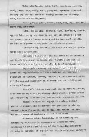 Vinson Placer Company articles of incorporation, September 7, 1904. Business is located in Baker City. Capital stock at $1 million with shares at $1 each. Purpose: to buy or claim water rights and to construct and maintain ditches and related aspects for delivering water to mining properties of every kind, nature and description; to acquire and operate power plants of every nature, etc. Recorded by W. L. Patterson, Notary Public on October 7, 1904. W. L. Vinson, W. S. Bowers, and C. A. Johns, co—owners.