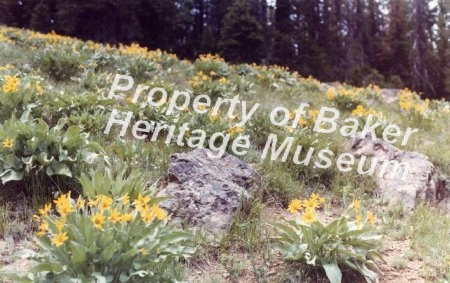 - Baker City, early color photo, looking west toward Elkhorns, Photographed from old reservoir hill. Slick surface. Print says, "On the Old Oregon Trail." "Elkhorn Range of the Blue Mountains, Baker, Oregon"... View Full Record