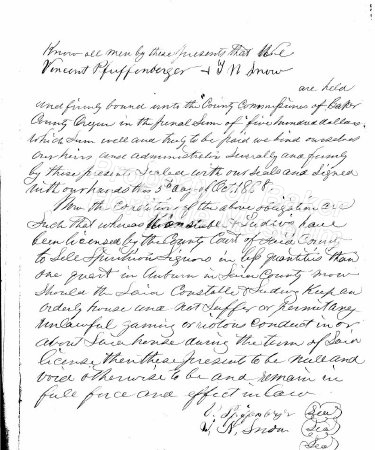 - Liquor bond, Vincent Pfuffenberger and J. N. Snow, October 5, 1868. Auburn papers #22... View Full Record