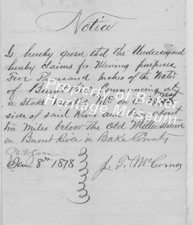 - Water location, R. D. McCord et al., on tributary for Sisley Creek above old Emigrant Road, Arrastras of Bohna, McCord & Co., for MIlling. August 3, 1876.... View Full Record