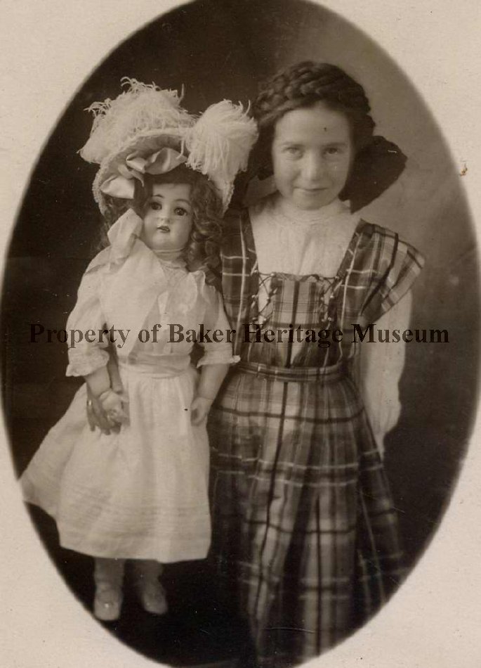 Black and white picture of Marvel Reynolds in a flannel dress with her doll in a white dress and feathered hat.