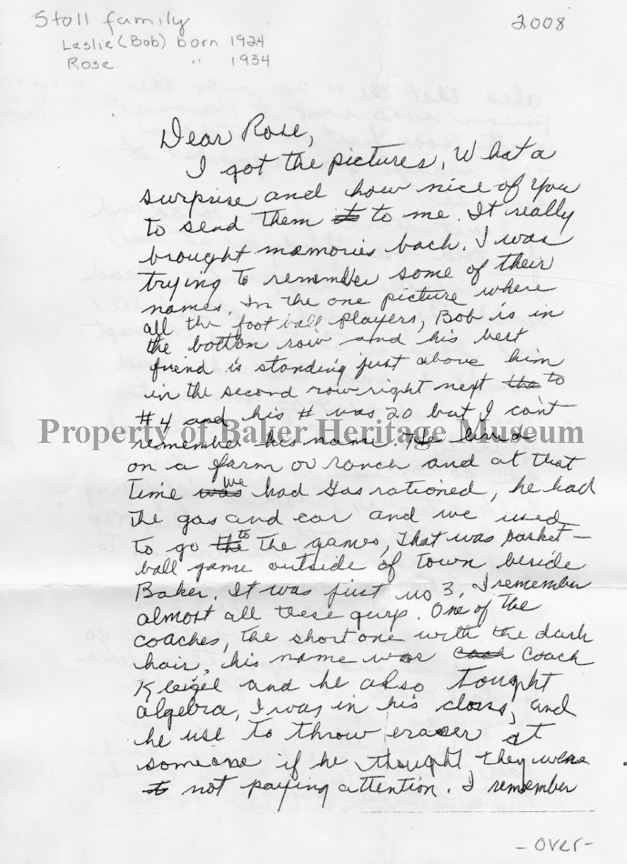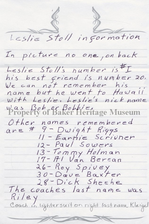 4 photos of Baker High School football team approximately 1941. Donor: Rose Hardwick, Eugene, Or.(photos a—f). (e: note identifying players; f: letter to RoseHardwick(Stoll) regarding pictures).