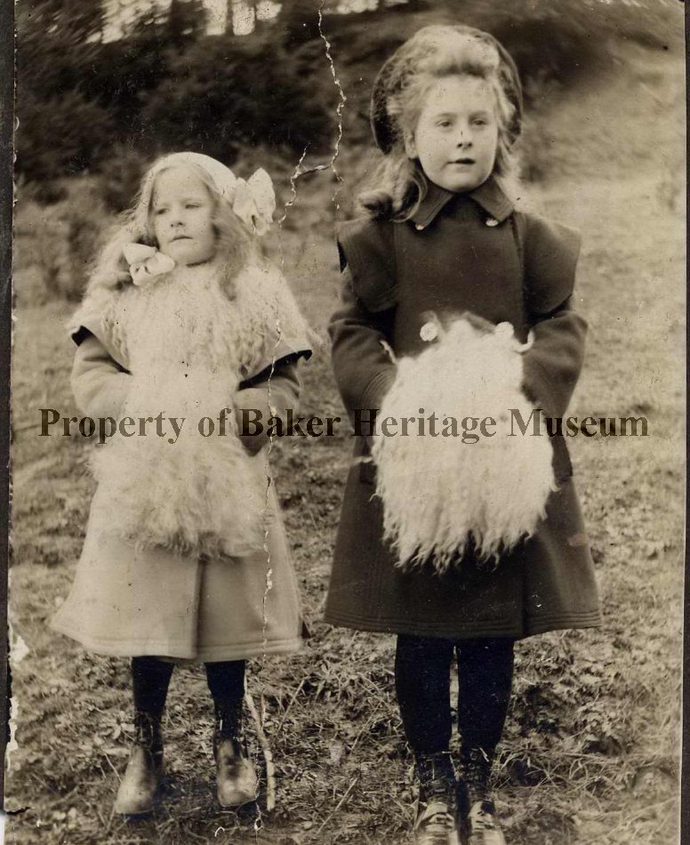 Outdoor photo of two young girls wearing coats, hats and mufflers.
