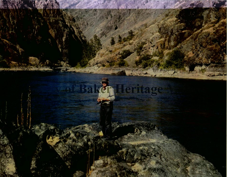 A—Fisherman standing by river. B — Old Willys Jeep Wagon parked on overlook.