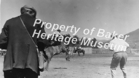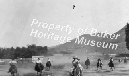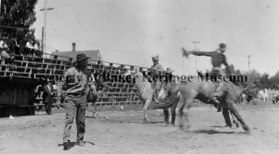 Rodeo at old rodeo/ballpark grounds between Ash and Clark streets on Valley in Baker City, early 1900's. Grandstands can be seen in the background