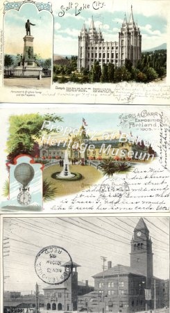 Continuation: Postcard album of Miss Minnie Moeller, in both Sumpter and Baker City, Oregon, Box 442. Cards range in age from 1904 postmarks to 1907. Some are leather. Many relate to the Lewis and Clark Exposition in Portland. All have been sent through the mail. This album is stored with the photo albums in the accession room at the museum.