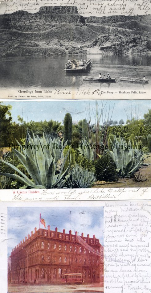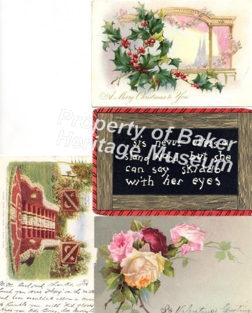 Continuation: Postcard album of Miss Minnie Moeller, in both Sumpter and Baker City, Oregon, Box 442. Cards range in age from 1904 postmarks to 1907. Some are leather. Many relate to the Lewis and Clark Exposition in Portland. All have been sent through the mail. This album is stored with the photo albums in the accession room at the museum.