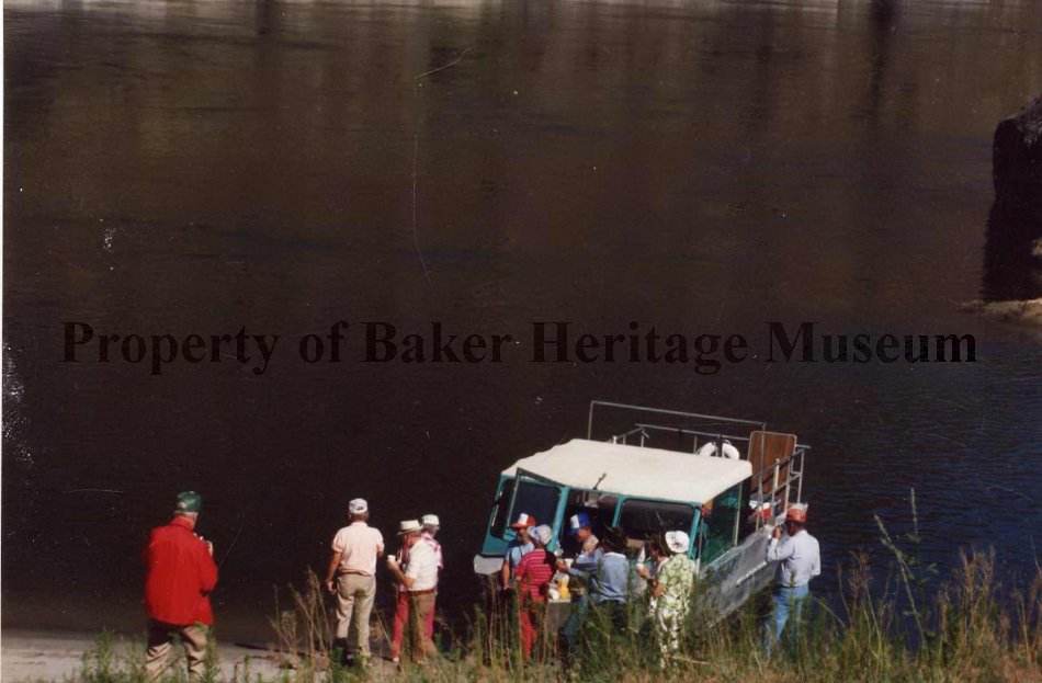 Color photo of Hells Canyon sight seeing boat with 13 people on bank of Snake River.