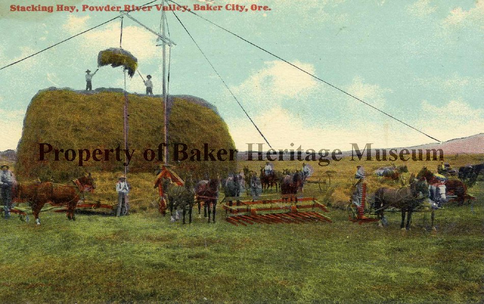 A postcard of people stacking hay near Baker City. The postcard says "Stacking Hay, Powder River Valley, Baker City, Ore." 2 copies of the same postcard.