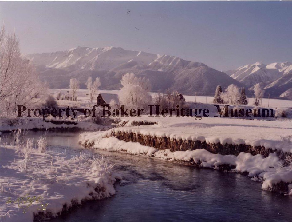 Powder River in winter, with Elkhorns in background. Photo by Eslyrt E Zikmund, 2001.