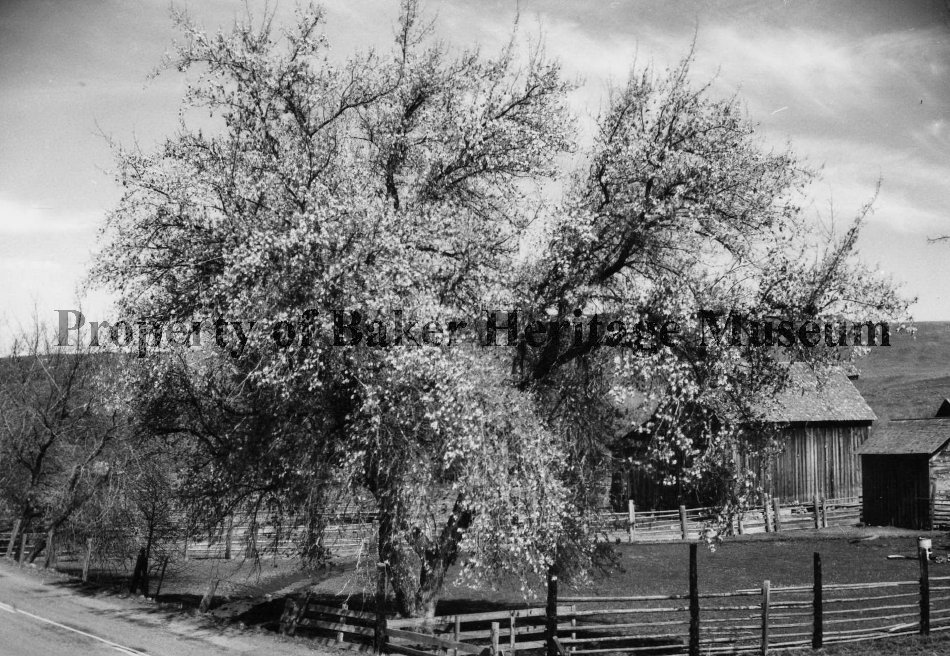 Farm house with wooden fence along highway (edge line visible). Flowering fruit tree, and hills in background.