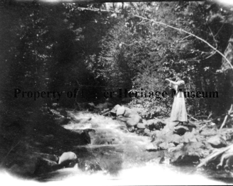 Early 1900s trip by wagon to Anthony Lakes pulled by Salisbury horses before day of autos. 2nd photo show woman in long dress fishing. 3rd photo is Gunsight Mountain at Anthony Lakes.