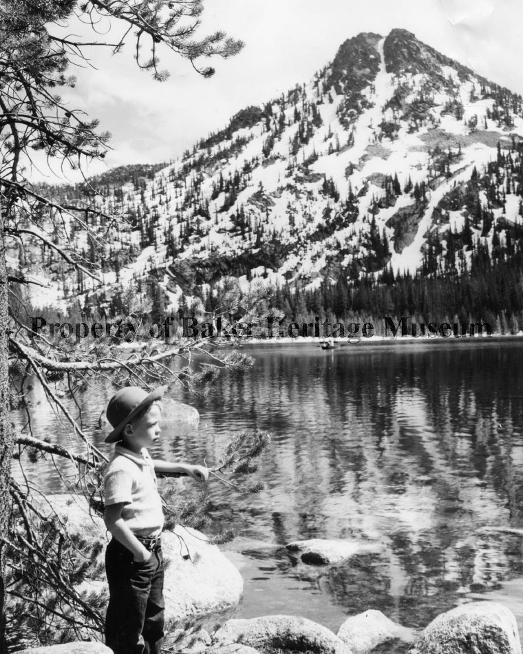 Photo of Boy and Boat on lake with Gunsite Peak in Back Ground.