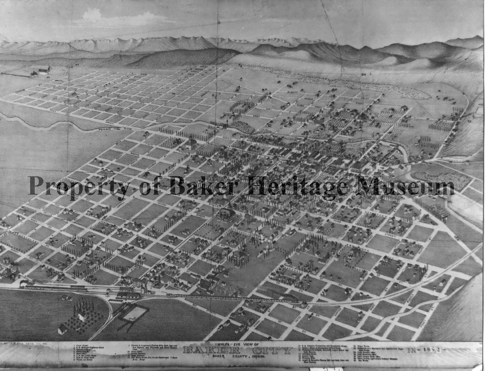 A photo of a map that shows the existing Baker City in 1892 and also the expected growth. Birds Eye View.