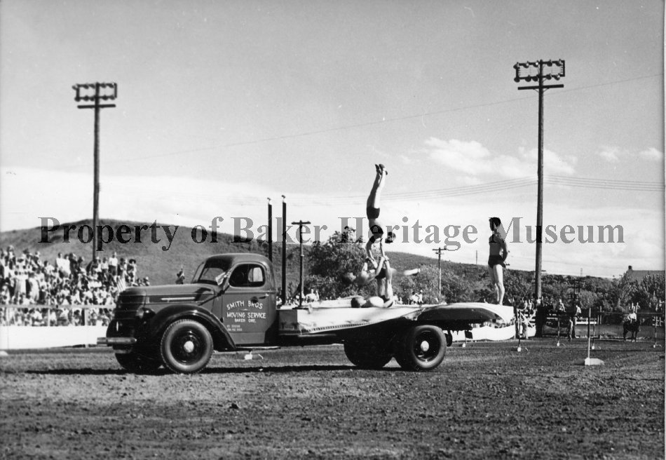 Charles, Wilbur, and Mark Smith, acrobatic weight lifting brothers, at 1937 Fourth of July rodeo and parade. Note: includes accession #s 85.83.1—21.