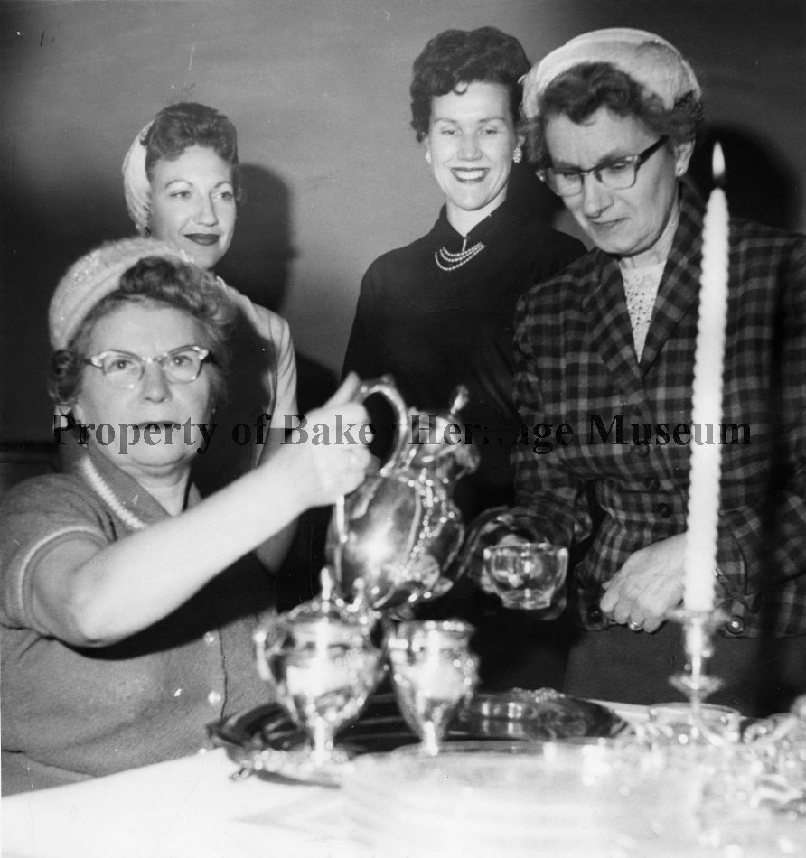 Four women posing for group shot during tea service. First woman is __ de Bell. Last woman is __ Young. Women are dressed formally in hats and suits. Ca. 1950.