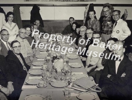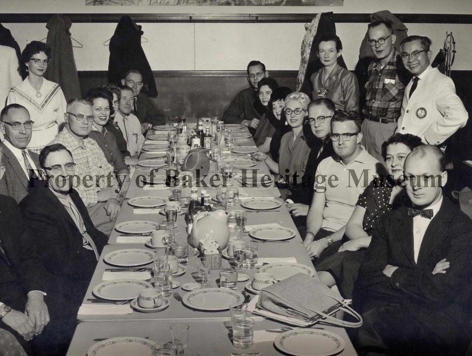 Left to right: Mary Barnes, Mrs. Cook, Nancy Herring, Mrs. Garner, Mrs. Valiente, Baker City Camera Club: Left side: Uma Peters, Harold Peters, unknown, Hermann Webb, Stuart Earl, Madellyn Earl, Ferd Renz, Charlie Clark, Gordon Bloom, Virginia Bloom. Right Side: unknown, unknown, Ron Bowers, Carl Holman, Vivian Holman, unknown, Mrs. Dagliesh, Russ Dagliesh, Jack Eng, Gaylord Ward, Ann Ward. (Oversized photo)