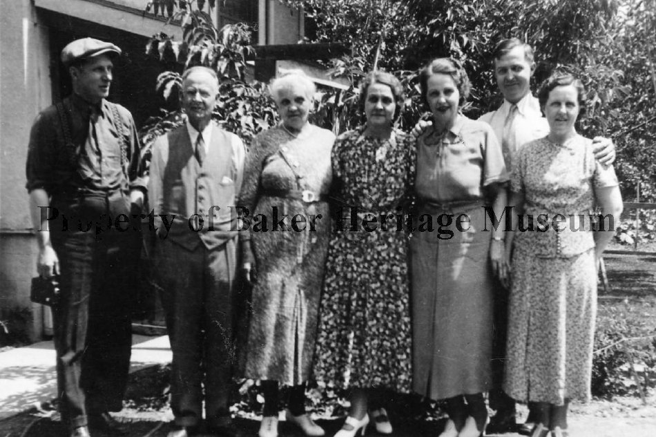 Black and white picture of the Smurthwaite family. Jesse Abraham, James Richard Sr, his wife Amelia, Verda Glen, Sarah Zella, James Richard Jr., Florence Laverne. Taken in the 1920s or 1930s.